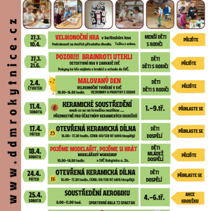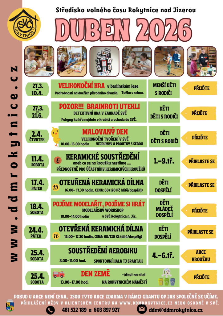 17.08.2026 Tábor je určený pro děti po ukončené 1.třídě ZŠ. Děti prožijí pět dnů nejen s keramickou hmotou - tvoření, prožitky, soutěže, hry, a to nejen v keramické dílně, ale i venku. Přicházet děti mohou mezi 8 - 9 hod. V průběhu dne budou tvořivé bloky, které budou proloženy hrami a soutěžemi. Konec ke...